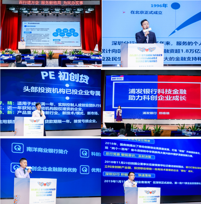 在啟動(dòng)儀式后的科創(chuàng)企業(yè)主題專場(chǎng)對(duì)接活動(dòng)中,深圳市科創(chuàng)委宣講了深圳地區(qū)充滿活力、富有效率的技術(shù)創(chuàng)新體系和基礎(chǔ)研究專項(xiàng)、平臺(tái)和載體專項(xiàng)、創(chuàng)新創(chuàng)業(yè)專項(xiàng)、協(xié)調(diào)創(chuàng)新專項(xiàng)等支持企業(yè)科技創(chuàng)新政策。建設(shè)銀行深圳市分行分享了集貸、投、孵、教于一體的科技創(chuàng)新孵化平臺(tái)——?jiǎng)?chuàng)業(yè)者港灣,可為中小科創(chuàng)企業(yè)提供全生命周期、連續(xù)可預(yù)期的創(chuàng)業(yè)支持,打造“金融 +科技 +產(chǎn)業(yè) +教育”的線下、線上科技創(chuàng)新綜合孵化生態(tài)。民生銀行深圳分行分享了精準(zhǔn)對(duì)接專精特新、小巨人的“科創(chuàng)貸”。招商銀行深圳分行分享了科創(chuàng)型企業(yè)全生命周期信貸產(chǎn)品體系和 PE初創(chuàng)貸、高新價(jià)值貸、創(chuàng)業(yè)擔(dān)保貸。浦發(fā)銀行深圳分行分享了根據(jù)科創(chuàng)企業(yè)成長(zhǎng)軌跡搭建服務(wù)產(chǎn)品體系以及專精特新小巨人貸、榮擔(dān)基金貸、融資擔(dān)保貸、上市促進(jìn)貸、科技多易貸、科技保險(xiǎn)貸。南洋商業(yè)銀行深圳分行分享了科創(chuàng)企業(yè)供應(yīng)鏈金融服務(wù)模式和1 +N商票保貼供應(yīng)鏈業(yè)務(wù)定制。
