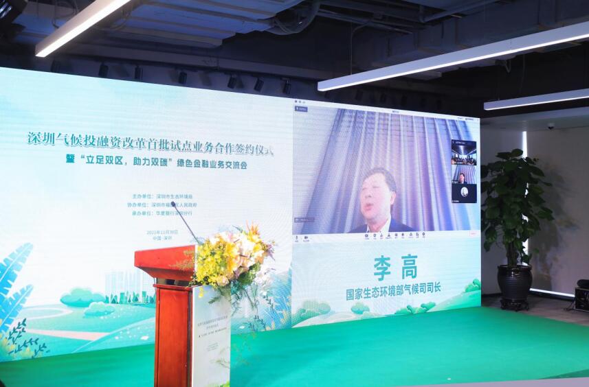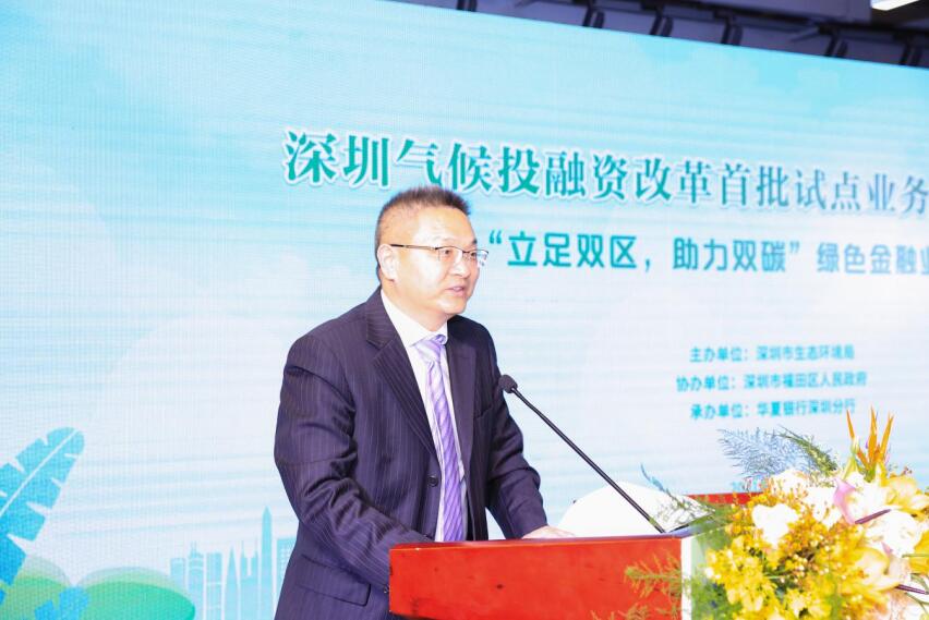 國家生態(tài)環(huán)境部氣候司司長(zhǎng)李高,深圳市政府副秘書長(zhǎng)劉昂,深圳市生態(tài)環(huán)境局局長(zhǎng)李水生,深圳市委改革辦副主任孫華明,福田區(qū)政府副區(qū)長(zhǎng)朱江,華夏銀行總行黨委委員、營銷總監(jiān)、深圳分行黨委書記、行長(zhǎng)陳傳龍等領(lǐng)導(dǎo)出席。深圳市政府、深圳市生態(tài)環(huán)境局、市委改革辦、中國人民銀行深圳市中心支行、福田區(qū)政府相關(guān)負(fù)責(zé)人、深圳市綠色企業(yè)代表、深圳市綠色相關(guān)行業(yè)協(xié)會(huì)代表、華夏銀行深圳分行相關(guān)單位代表等70余人參加活動(dòng)。