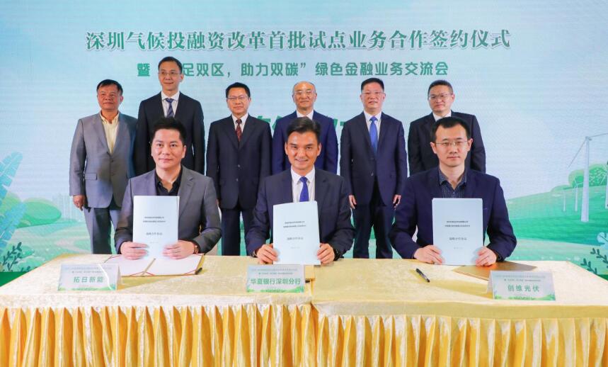 在與會(huì)領(lǐng)導(dǎo)嘉賓的共同見證下,華夏銀行深圳分行分別與深圳市創(chuàng)維光伏科技有限公司、深圳市拓日新能源科技股份有限公司簽署了《深圳氣候投融資改革首批試點(diǎn)業(yè)務(wù)合作協(xié)議》。
