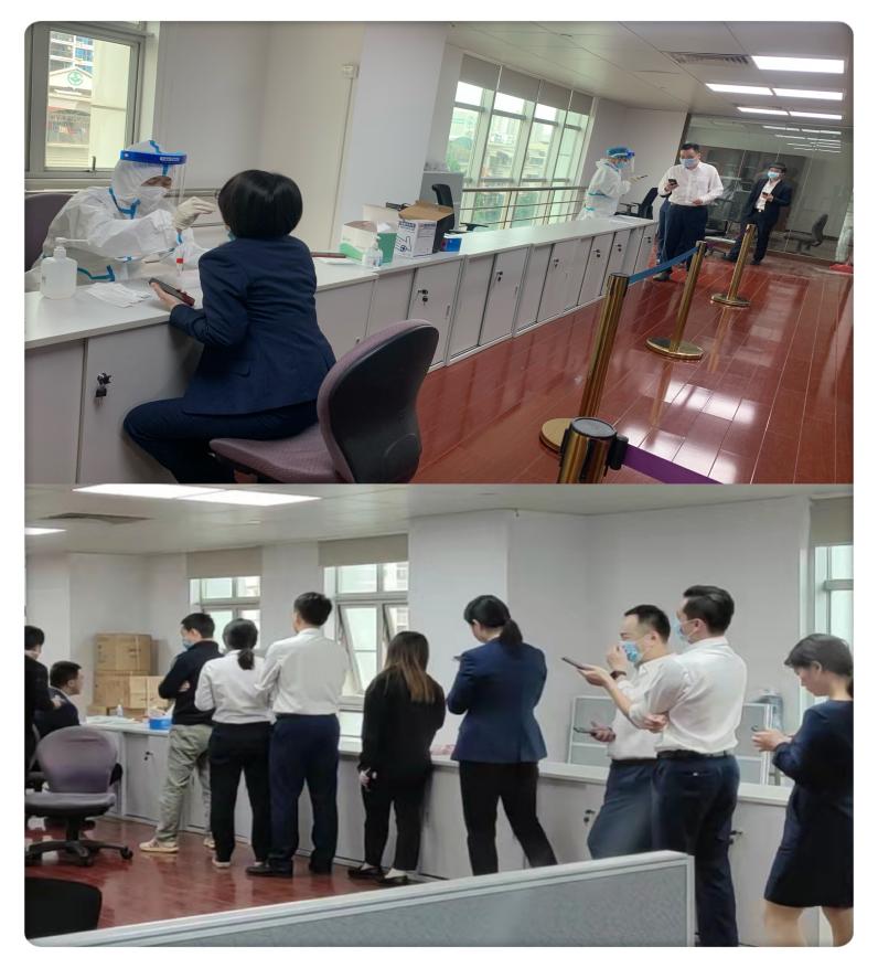 為確保疫情防控工作有力、有序、有效,深圳分行及時(shí)完善防疫專員機(jī)制、緊急處置疑似疫情流程機(jī)制、防疫物資保障機(jī)制,做到責(zé)任到人。結(jié)合實(shí)際,深圳分行還提出了嚴(yán)守防疫紀(jì)律的要求,黨員領(lǐng)導(dǎo)干部帶頭執(zhí)行出行管理、場所管理、請示報(bào)告等方面的規(guī)定。員工是企業(yè)最大的財(cái)富,為切實(shí)保障員工生命健康,考慮到員工自行進(jìn)行核酸檢測預(yù)約、排隊(duì)耗時(shí)較長,迅速行動(dòng),經(jīng)多方協(xié)調(diào),深圳分行聯(lián)系核酸檢測機(jī)構(gòu)在分行駐點(diǎn)為員工進(jìn)行集中檢測。與此同時(shí),深圳分行為各經(jīng)營單位配置足量防疫物資,尤其是消毒用品,能夠滿足第一時(shí)間對經(jīng)營場所的消殺需求。