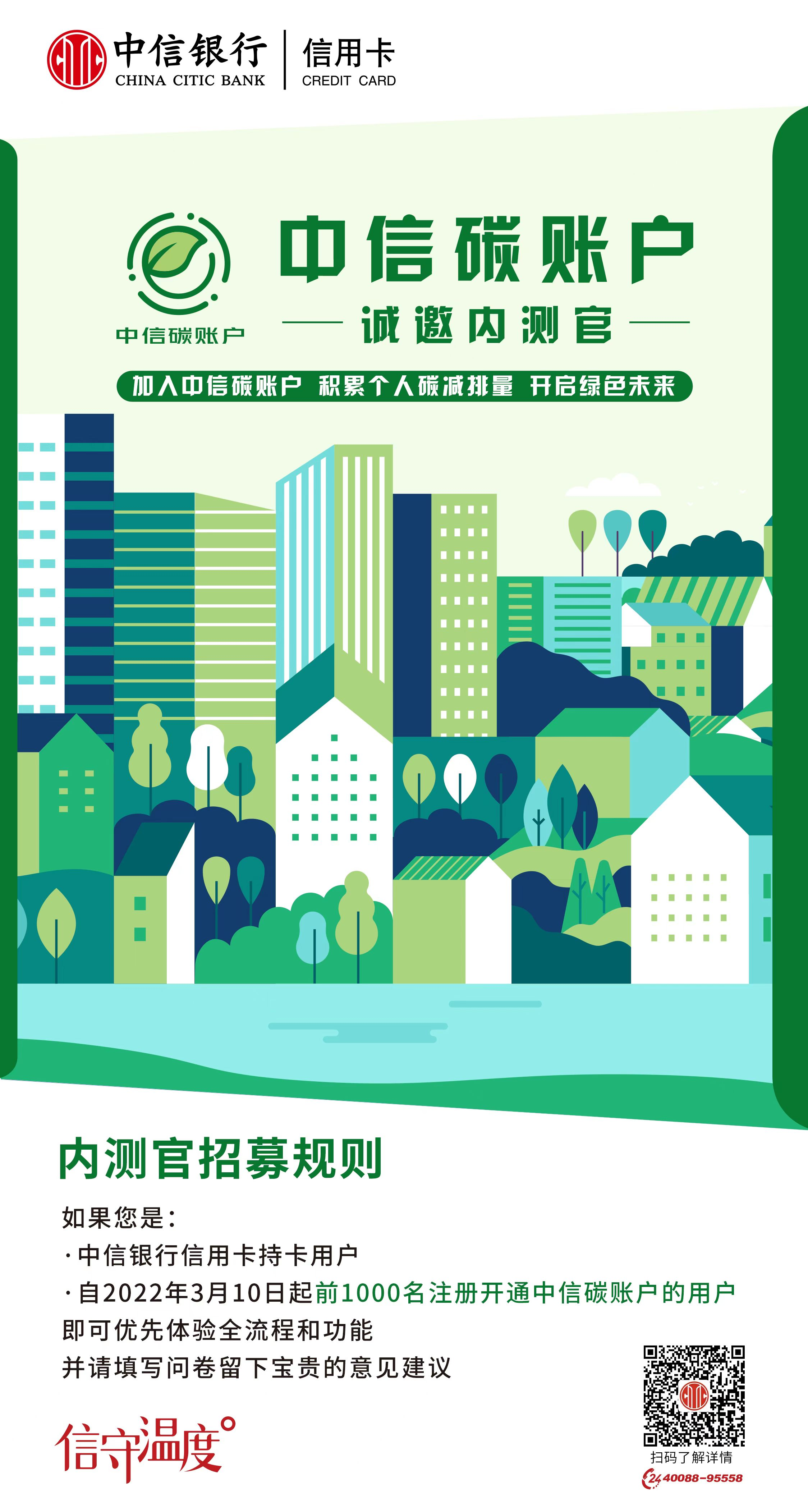 時(shí)值中國植樹節(jié)前夕,“中信碳賬戶”內(nèi)測版現(xiàn)已上線,于3月10日起公開招募1000名用戶參與內(nèi)測版體驗(yàn),首批體驗(yàn)官登錄中信銀行信用卡“動(dòng)卡空間”APP,即可在線開通個(gè)人碳賬戶,獲取關(guān)聯(lián)個(gè)人低碳行為的碳減排量,并可對碳賬戶的內(nèi)測版功能提供優(yōu)化建議。據(jù)中信銀行相關(guān)負(fù)責(zé)人介紹,目前,內(nèi)測版已經(jīng)上線生活繳費(fèi)網(wǎng)上辦理(含水費(fèi)、電費(fèi)、燃?xì)赓M(fèi)等)、申請電子信用卡、開通電子賬單等低碳行為的碳減排量核算。即將上線的公開版還將包含綠色出行、二手回收等更豐富的綠色低碳生活場景。