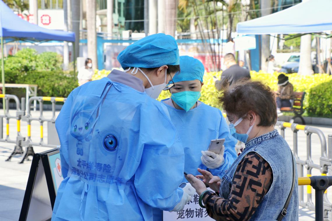 自3月9日起,中國太保壽險(xiǎn)深圳分公司志愿者每天分兩批前往蓮花一村社區(qū)核酸點(diǎn)開展志愿服務(wù)。在社區(qū)入口,他們嚴(yán)守“入口關(guān)”,輕聲提醒社區(qū)居民和訪客掃描“場(chǎng)所碼”,認(rèn)真查驗(yàn)每一位居民和訪客的健康碼情況;在核酸服務(wù)隊(duì)伍,他們耐心維持隊(duì)伍秩序,提醒居民做好自我防護(hù)、保持一米距;在核酸服務(wù)綠色通道處,他們以熱情的態(tài)度詳細(xì)解答居民的疑惑,指導(dǎo)老人、小孩和特殊人群掃碼、填寫資料;在居民樓里,他們拿著小喇叭,一層樓一層樓地提醒居民們下樓做核酸......他們?nèi)σ愿?,以扎?shí)的工作、貼心的服務(wù)當(dāng)好疫情聯(lián)防聯(lián)控的“守門員”“服務(wù)員”“宣傳員”,用實(shí)際行動(dòng)點(diǎn)起了陰霾下幾抹火紅的溫暖,架起了抗疫防疫“暖心橋”。