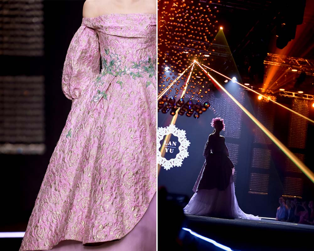 盛典秀場真實還原了巴黎時裝周舞臺,讓觀眾擁有了極致的感官體驗。40余套不同風格的禮服傾情展出設(shè)計中如同水墨畫恣意揮灑的筆墨,將山河間幽深、清遠、縹緲的東方韻味表現(xiàn)得淋漓盡致。