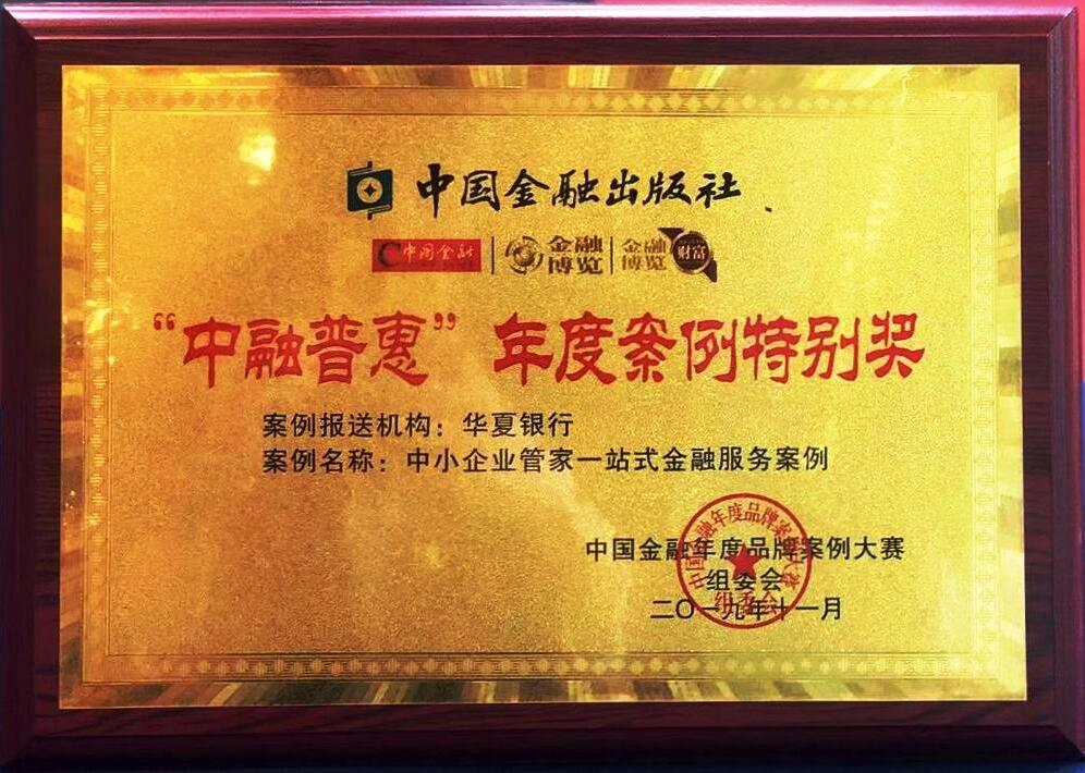 2019年11月,在“第二屆(2019)中國金融年度品牌案例大賽”上,華夏銀行獲得“中融普惠”年度案例特別獎。