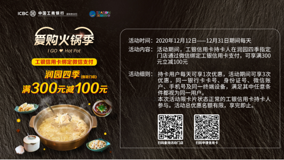12月31日前每天,微信綁定工銀信用卡在潤園四季指定門店消費滿300元減100元!