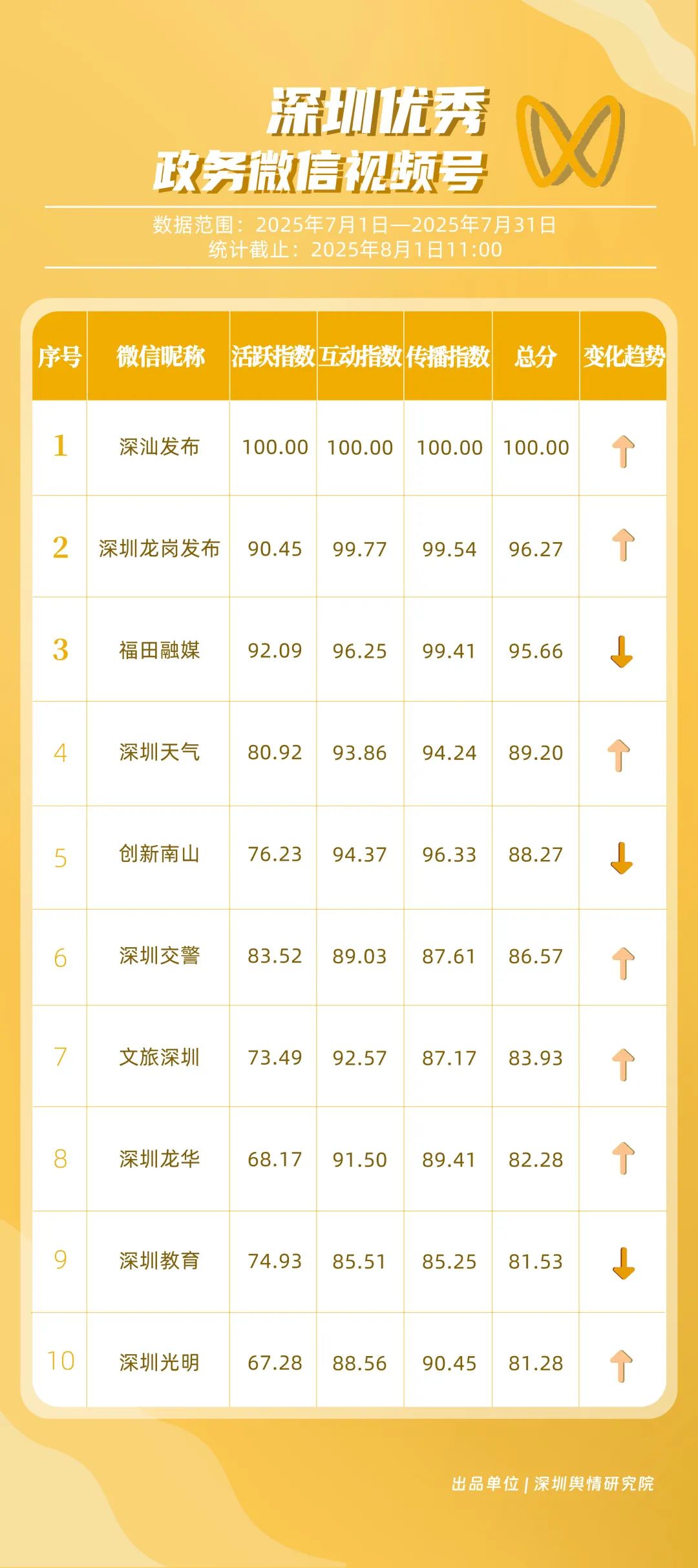7月,獲得“深圳優(yōu)秀政務(wù)微信視頻號”稱號的是“深汕發(fā)布”“深圳龍崗發(fā)布”“福田融媒”“深圳天氣”“創(chuàng)新南山”“深圳交警”“文旅深圳”“深圳龍華”“深圳教育”“深圳光明”。其中,“深汕發(fā)布”持續(xù)輸出熱點內(nèi)容,收獲大量網(wǎng)民關(guān)注、互動,三項指標均達滿分,位居榜首;“深圳龍崗發(fā)布”“福田融媒”緊隨其后,總分均超過95分,兩賬號通過多樣化的內(nèi)容呈現(xiàn),在活躍、互動及傳播等方面均有出色表現(xiàn);“深圳天氣”“創(chuàng)新南山”“深圳交警”等賬號也獲得不錯成績,總分均在85分以上。上榜微信視頻號精準把握平臺特性,高效傳遞了政務(wù)信息,更成為展現(xiàn)城市活力、拉近政府與民眾距離的重要窗口。