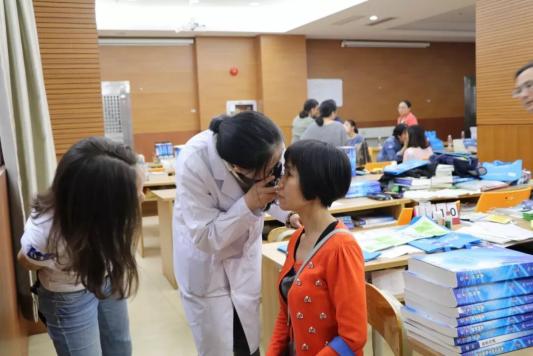 杜冰教授在給居民檢查眼睛。