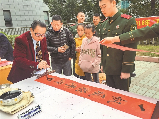 書法家葉自力的“攤位”前人氣也很旺,他主攻“?!弊?。葉自力筆力遒勁,當(dāng)日他書寫的是“智永體”的福字。每每有官兵或家屬過來求字,寫罷,他都善意提醒,“小心點,端平放,小心墨溢出來了?!碑嫾覄⒄窈.嫷哪档ひ埠堋皳屖帧?,供不應(yīng)求。中藝馨書畫院院長黃漢明表示,春節(jié)降至,組織書畫家到軍營里為官兵以及官兵家屬們揮春,既是送祝福也是文化交流?,F(xiàn)場有求字的官兵表示,這樣的活動很好。(記者 劉莎莎 文/圖)