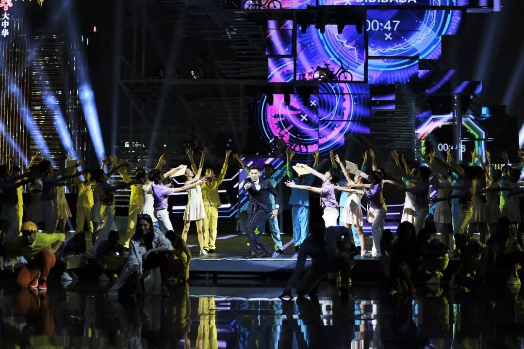 在本場晚會上,為了響應(yīng)“追夢”主題,李盾聯(lián)合百 老匯頂級音樂劇導(dǎo)演卓依·馬可尼利、國際著名作曲家阿鯤,著名作詞家梁芒為晚會創(chuàng)作了一段音樂劇形式的節(jié)目《嘀嘀嗒嗒》。作為節(jié)目的重心,主創(chuàng)團隊在劇中融入了原創(chuàng)音樂劇《深南大道》的主題曲《新的一天》選段。內(nèi)容以深圳每一個上班族的工作和生活作為出發(fā)點,以音樂劇的形式設(shè)計了如秘書、創(chuàng)業(yè)者、設(shè)計師、程序員、義工和銷售等等不同的角色,年輕的演員、動聽的旋律、跌宕的劇情、新穎的節(jié)奏,點燃了現(xiàn)場觀眾的熱情。精彩的表演配合晚會場地絢爛激情的燈光秀,以及舞臺中心十多米高被命名為“追夢人”的LED裝置,不時更換相應(yīng)的場景多媒體,整體形成如夢幻般的光影效果。
