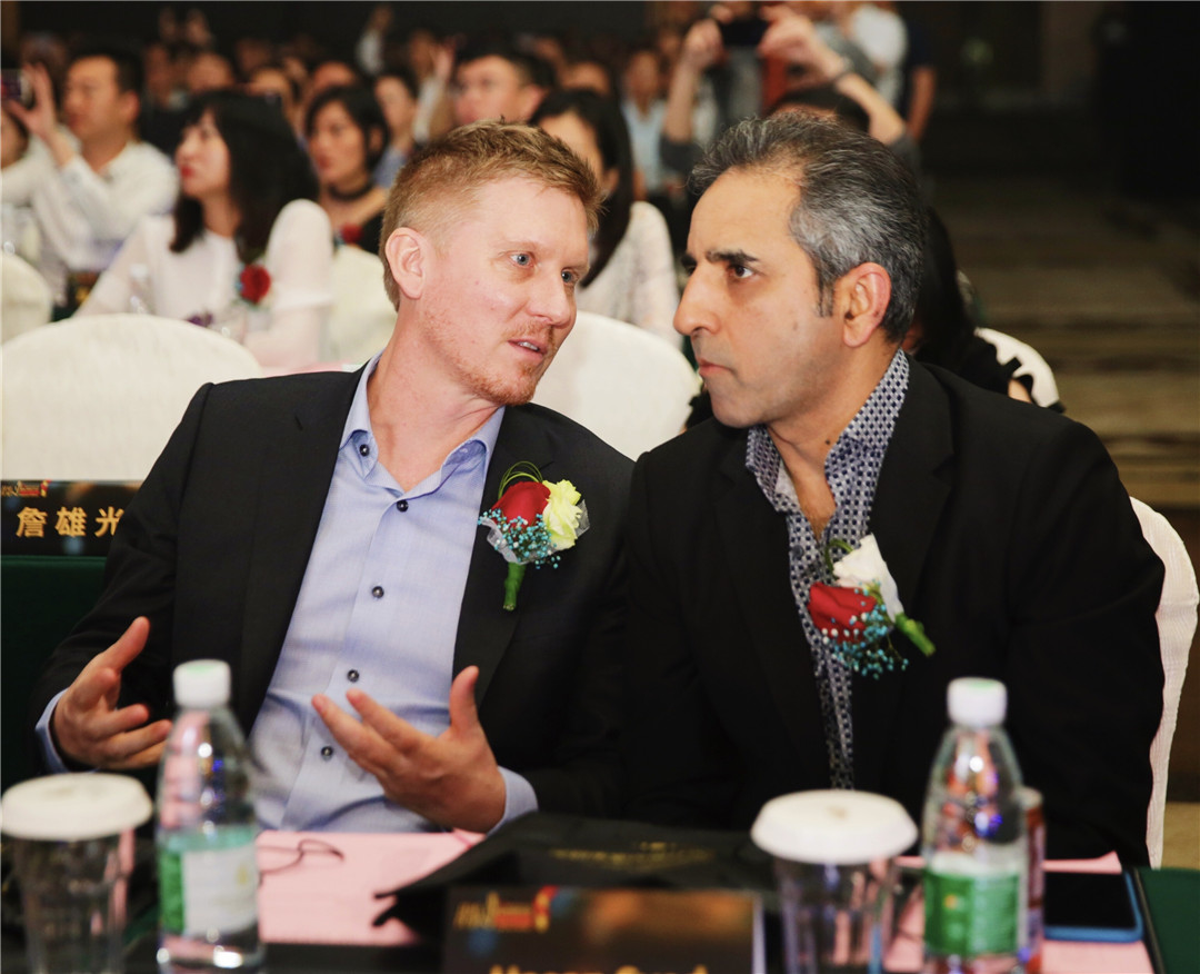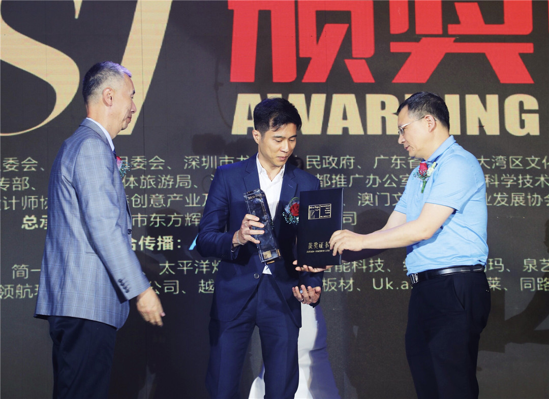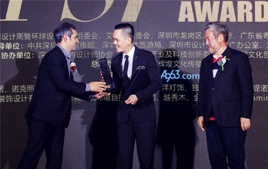 △中央美術(shù)學(xué)院建筑設(shè)計(jì)研究院院長(zhǎng)、博士生導(dǎo)師王鐵,美國(guó)Gensler上海公司總監(jiān)Hasan Syed為廣州設(shè)計(jì)師黃永才頒發(fā)“最佳娛樂(lè)空間設(shè)計(jì)獎(jiǎng)”