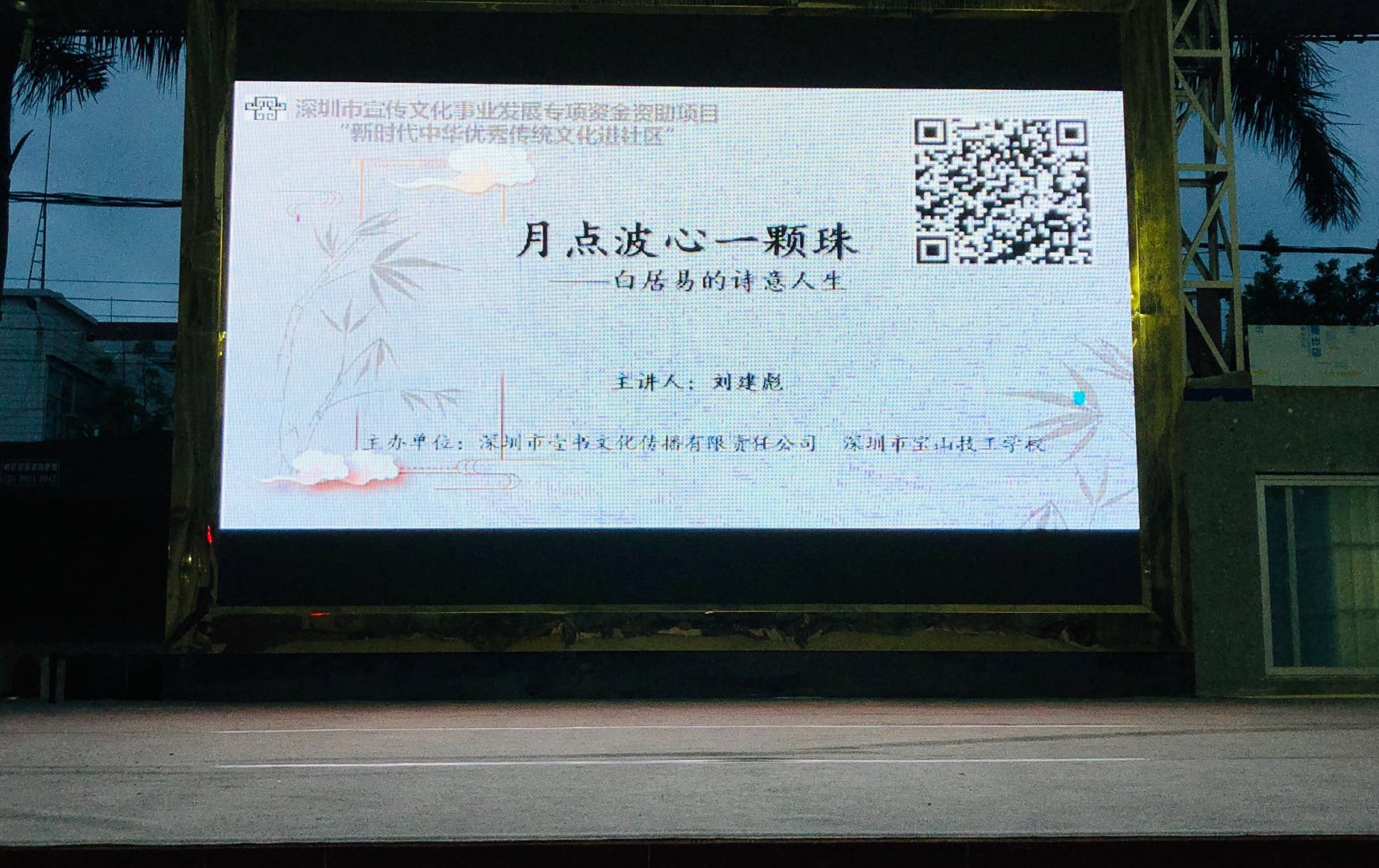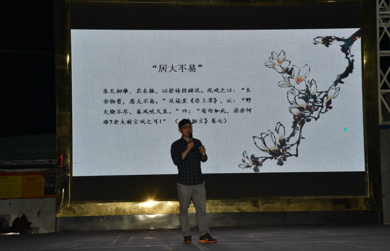 深圳新聞網(wǎng)訊 5月29日晚上,“新時代中華優(yōu)秀傳統(tǒng)文化進(jìn)社區(qū)”系列活動第三場公益文化講座之“月點(diǎn)波心一顆珠——白居易的詩意人生”在深圳市寶山技工學(xué)校寶山大舞臺拉開帷幕,由愛詩家創(chuàng)始人劉建彪帶領(lǐng)聽眾一同走進(jìn)“詩王”的詩意世界,感悟其至情至性。