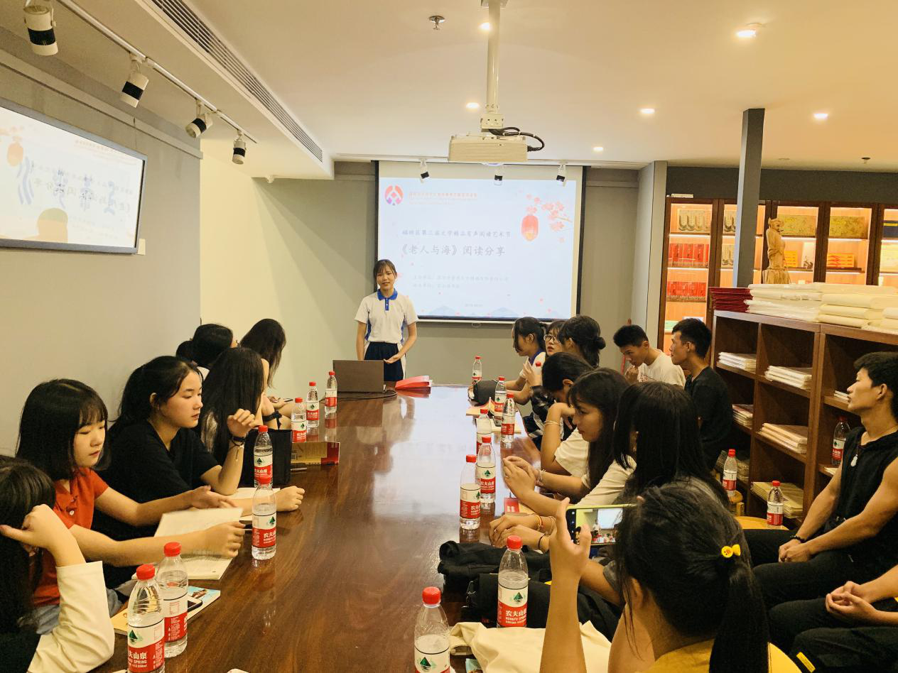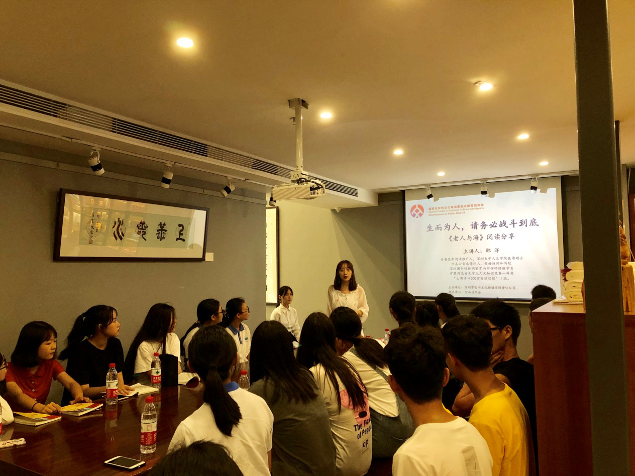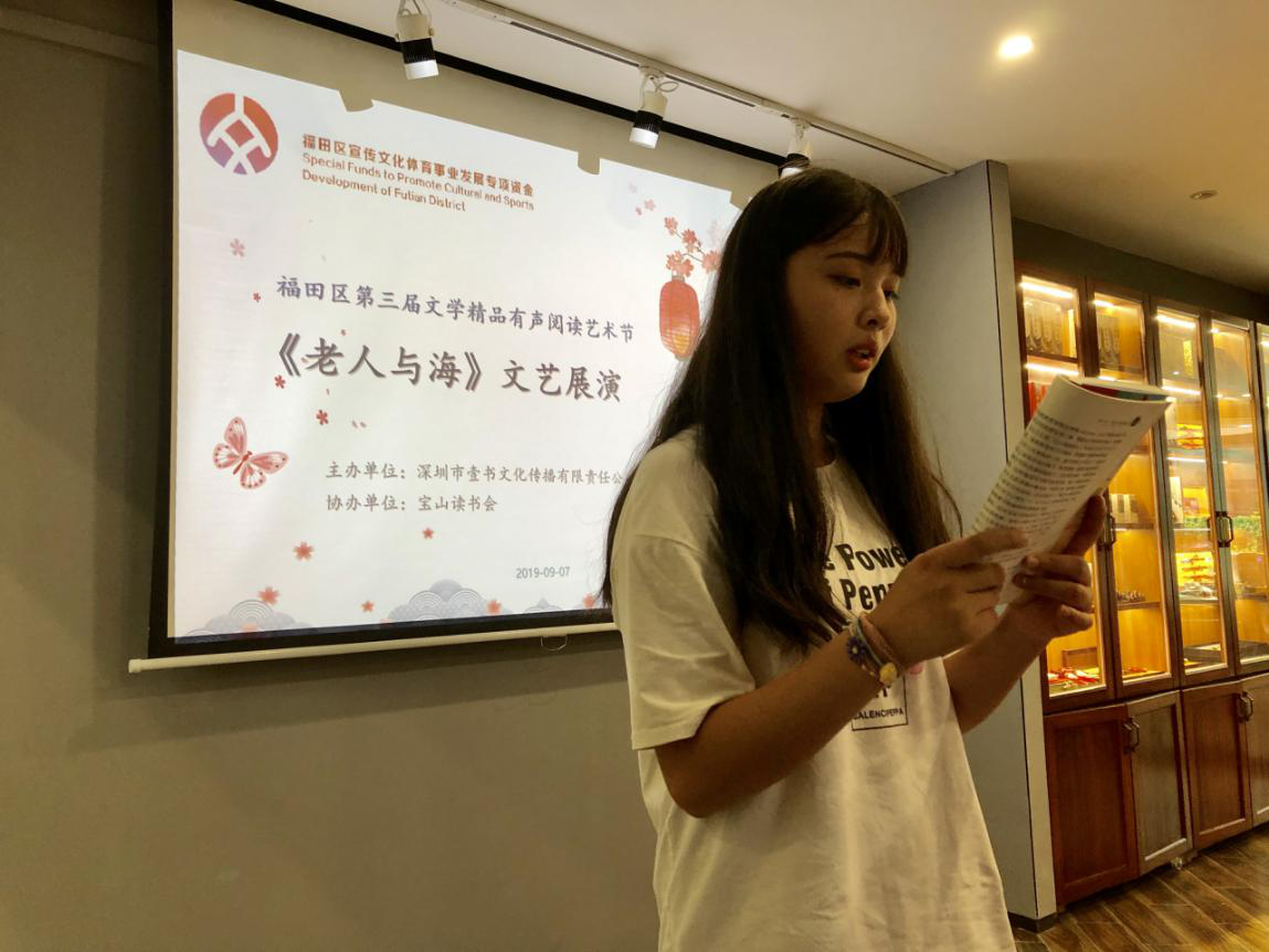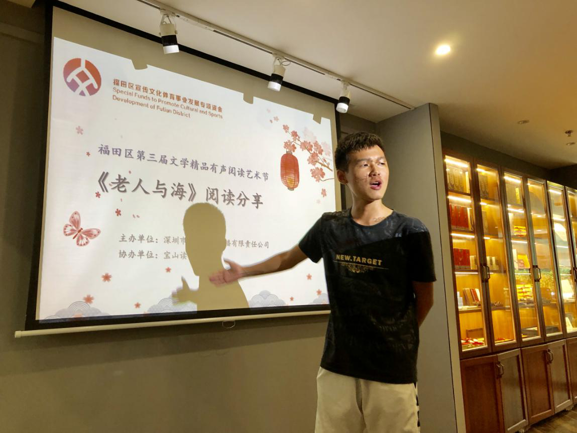 深圳新聞網(wǎng)訊 2019年9月7日,由深圳市壹書文化傳播有限責(zé)任公司主辦、寶山讀書會(huì)協(xié)辦的“福田區(qū)第三屆文學(xué)精品有聲閱讀藝術(shù)節(jié)”之《老人與?!烽喿x分享會(huì)暨文學(xué)作品朗誦會(huì)在簡(jiǎn)閱書吧香蜜湖店成功舉辦。來自深圳市寶山技工學(xué)校的學(xué)子們?cè)谥髦v人的啟示下分享閱讀感悟、誦讀精彩文摘,在文藝展演中體會(huì)圣地亞哥抗擊命運(yùn)的人生哲學(xué)。