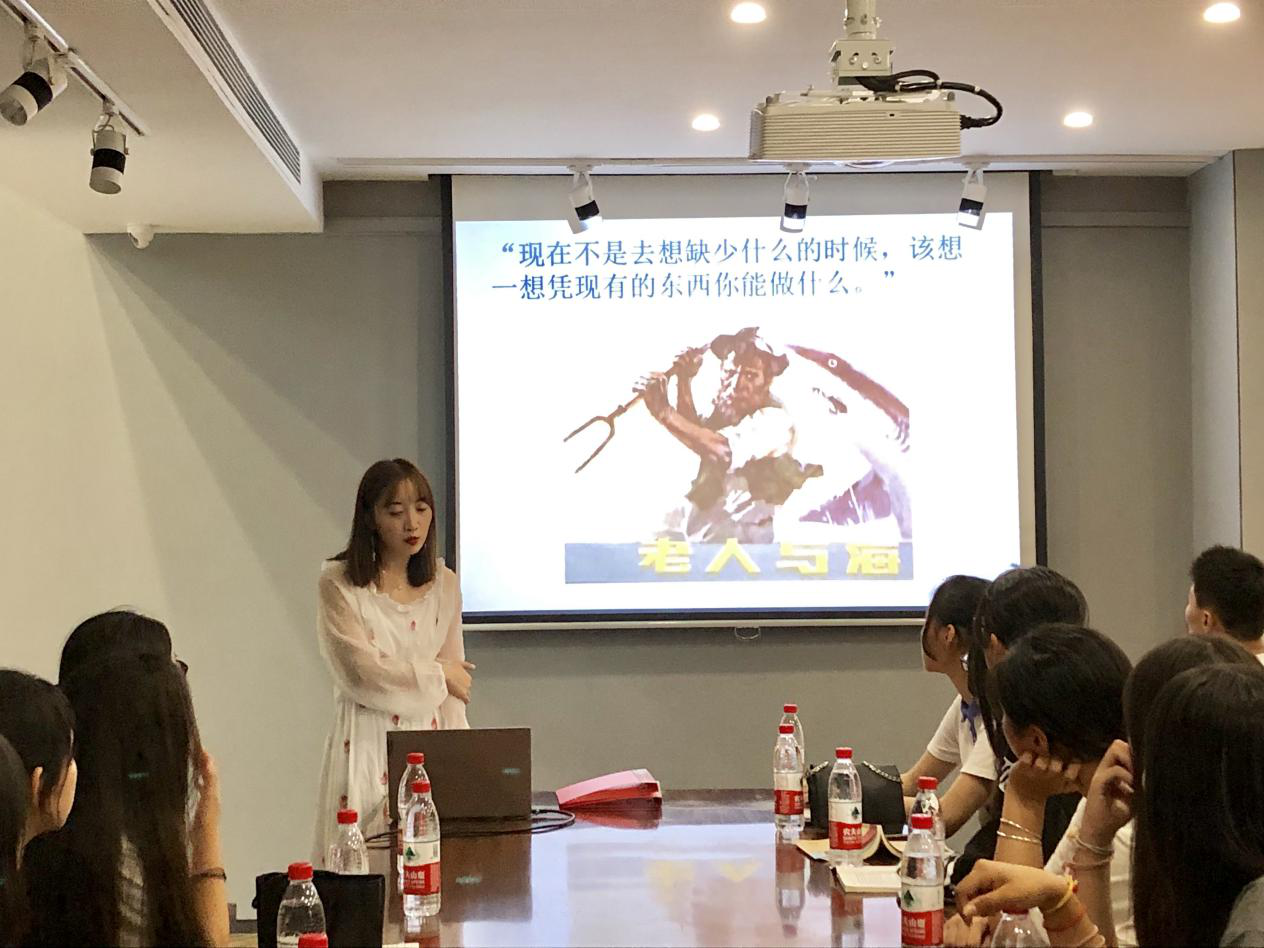 《老人與?!吠ㄟ^講述一個(gè)老漁夫的故事,揭示了人類共同的命運(yùn),給讀者帶來關(guān)于勇氣、不屈不撓、與命運(yùn)作斗爭(zhēng)的精神啟迪。圍繞“生而為人,請(qǐng)務(wù)必戰(zhàn)斗到底”這一主題,邵洋提出了“是選擇放棄,還是一往直前?”這一問題,引起在座同學(xué)的思考。隨后,她又通過解讀《老人與海》中的喻象與藝術(shù)、生命與理想,為同學(xué)們總結(jié)值得學(xué)習(xí)的寫作思路。