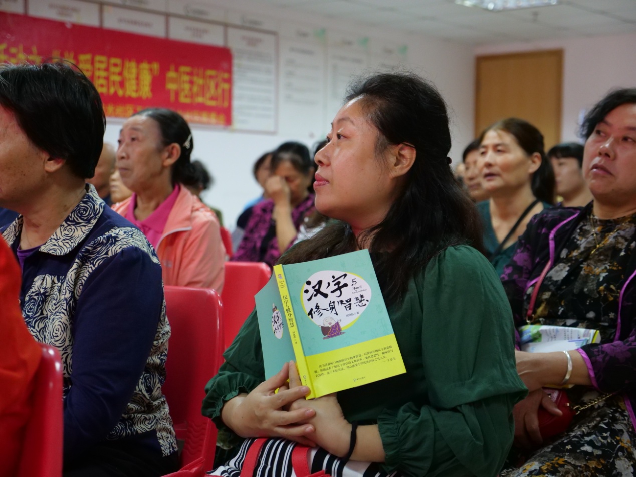 活動現(xiàn)場,珠光社區(qū)的叔叔阿姨們坐得整整齊齊,人手一本《深圳市民公約》冊子和《漢字與修身智慧》學習資料,認真地翻閱著。