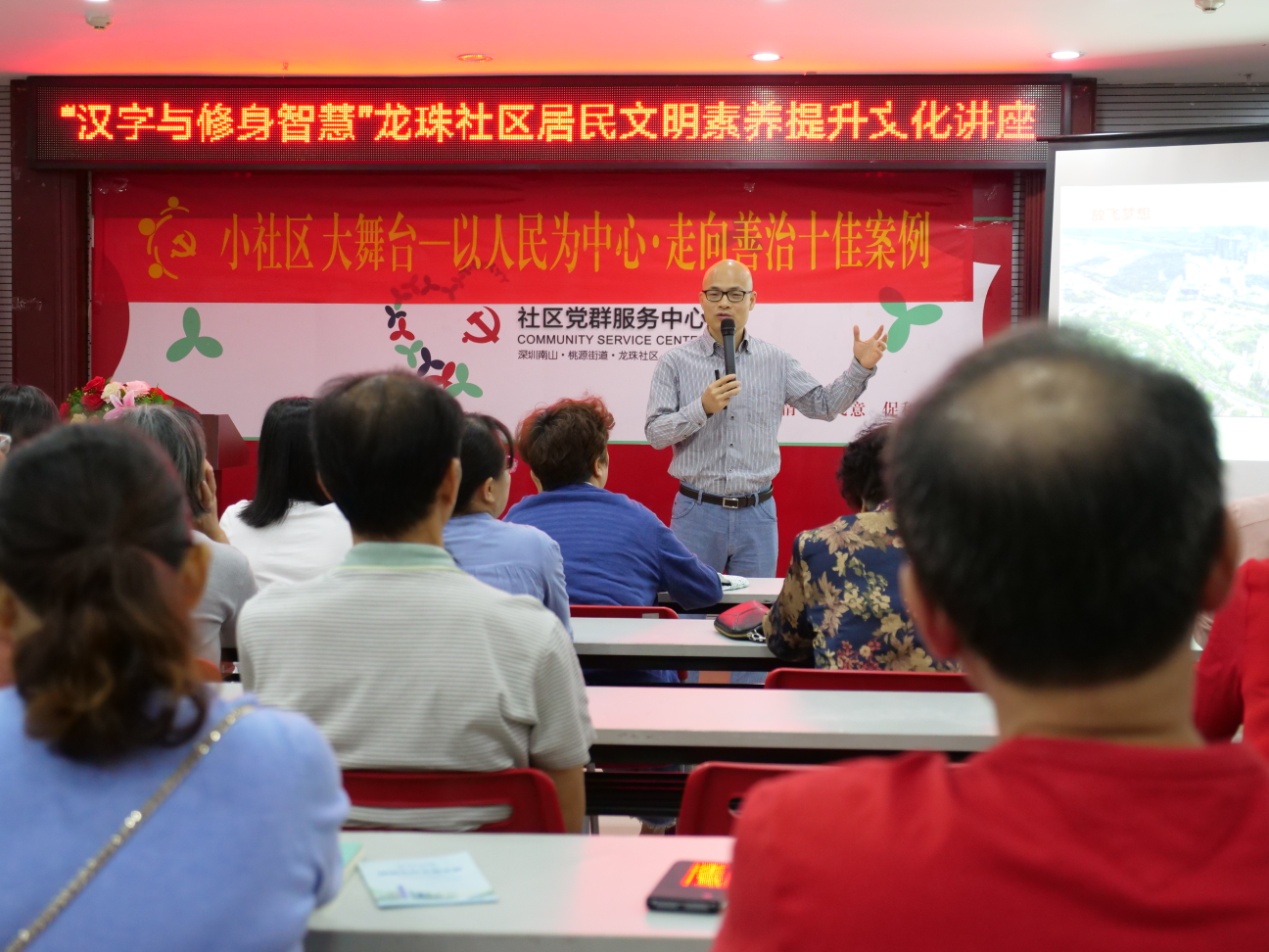 深圳新聞網(wǎng)訊 為更好地創(chuàng)建第六屆全國文明城市,以創(chuàng)新的活動形式提升社區(qū)居民的文明素養(yǎng),11月15日上午,龍珠社區(qū)舉行了“‘漢字與修身智慧’社區(qū)居民文明素養(yǎng)提升”專題文化講座,邀請壹讀書會創(chuàng)始人、知名閱讀推廣人、《漢字與修身智慧》的作者劉建彪擔(dān)任主講嘉賓,從中華文明的基因(漢字)出發(fā),解讀深圳市民公約,旨在啟發(fā)居民在中華優(yōu)秀傳統(tǒng)文化的感召之下,踐行文明禮儀,用實際行動去推進文明城市的創(chuàng)建。