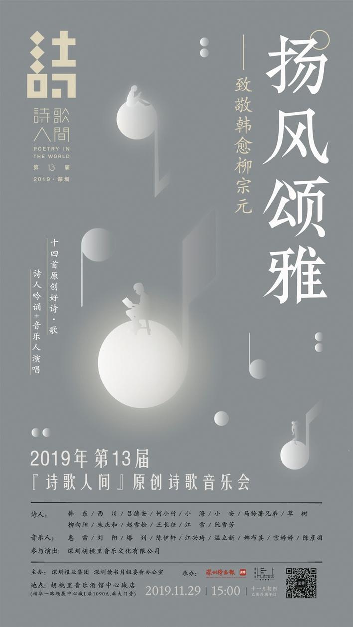 本屆“詩(shī)歌人間”由深圳讀書(shū)月組委會(huì)辦公室、深圳報(bào)業(yè)集團(tuán)主辦,深圳特區(qū)報(bào)社、深圳合縱文化集團(tuán)承辦,并得到了深圳市宣傳文化基金支持。今年,“詩(shī)歌人間”再度牽手老朋友合縱文化集團(tuán),以詩(shī)歌朗誦加歌唱的方式,于11月29日下午3點(diǎn)在合縱旗下胡桃里音樂(lè)酒館中心城店共同打造重頭活動(dòng)“第十三屆‘詩(shī)歌人間’原創(chuàng)詩(shī)歌音樂(lè)會(huì)”。屆時(shí),深圳特區(qū)報(bào)及“讀特”客戶端將全程跟蹤報(bào)道,“詩(shī)歌人間”音樂(lè)會(huì)盛況將通過(guò)“讀特”等平臺(tái)在網(wǎng)絡(luò)同步直播。通過(guò)深圳特區(qū)報(bào)“讀特”客戶端成功報(bào)名參與現(xiàn)場(chǎng)活動(dòng)的市民,還將獲得專屬精美紀(jì)念品。