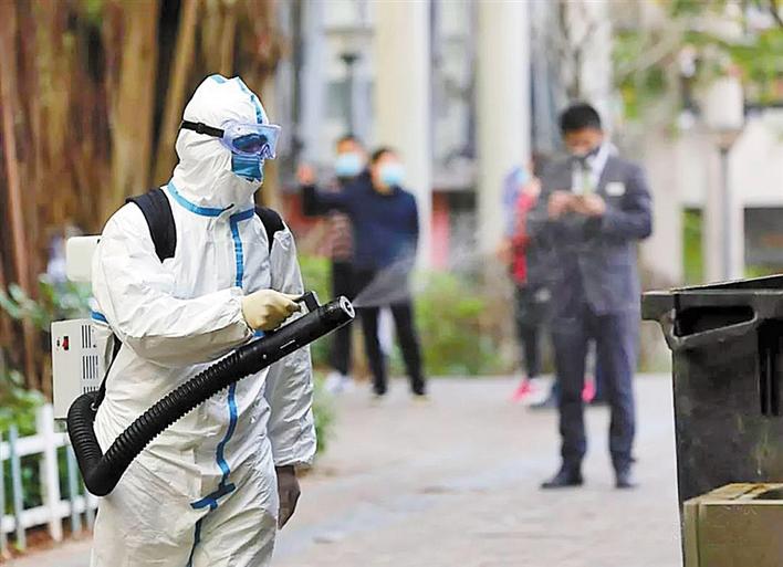 ▲對垃圾區(qū)進行消殺。(趙青 攝)