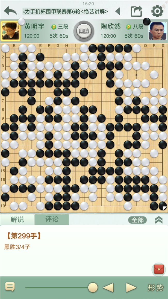 第三臺,陶欣然執(zhí)黑對陣小將黃明宇。局勢幾經(jīng)反復(fù),幸運(yùn)3/4子獲勝。