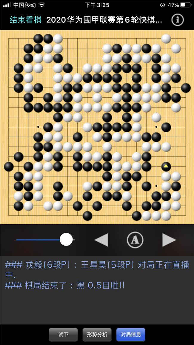 本局中盤白棋打入右邊黑空,損失較大,黑優(yōu)勢,之后黑棋官子階段連續(xù)失誤被白棋逆轉(zhuǎn)中盤勝。