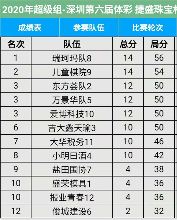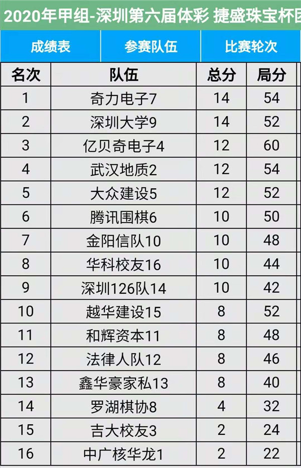 見圳客戶端?深圳新聞網(wǎng)2020年11月15日訊(記者周錦春)第六屆“體彩?捷盛珠寶杯”深圳市圍棋聯(lián)賽繼續(xù)在羅湖區(qū)藝嘉大酒店展開,今天是第三場,有第7輪至第9輪的比賽。目前,超級組中,瑞珂瑪隊(duì)、兒童棋院隊(duì)在積分榜上排名第一第二,繼續(xù)領(lǐng)先;甲級組中,奇力電子、深圳大學(xué)在積分榜上排名第一第二。具體賽程結(jié)果請看本文附后表格。