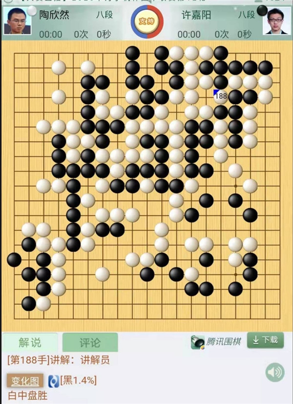 第一臺(tái)慢棋,由深圳隊(duì)的陶欣然八段執(zhí)白對(duì)陣江西隊(duì)的許嘉陽八段。雙方開局平穩(wěn),中盤黑棋侵消左邊白棋大模樣時(shí)行棋過分,遭到白棋反擊后黑棋較為危險(xiǎn)。隨即作戰(zhàn)形成對(duì)殺,白棋沒有下出簡(jiǎn)明的快一氣變化,連續(xù)失誤后形成黑棋有利的劫爭(zhēng)。劫爭(zhēng)中黑棋卻出現(xiàn)嚴(yán)重失誤,由殺白變成了白棋便宜巨大的轉(zhuǎn)換,最終投子認(rèn)負(fù),陶欣然執(zhí)白中盤勝許嘉陽。