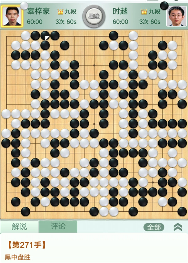 第四臺(tái)快棋,是兩位世界冠軍的對(duì)決,由深圳隊(duì)的時(shí)越九段執(zhí)黑快棋對(duì)陣江西隊(duì)的辜梓豪九段。開局至中盤雙方氣勢(shì)如虹,各自棄取,局面依然接近。之后黑棋下方定型失誤,白棋取得領(lǐng)先。在右下的劫爭(zhēng)中白棋判斷出現(xiàn)失誤,使黑棋扳回了局面。進(jìn)入官子階段,黑棋不顧中央隱患搶占右邊官子,白棋如果抓住機(jī)會(huì)在中央黑空出棋形成劫爭(zhēng)則局面復(fù)雜。實(shí)戰(zhàn)白棋沒敢開劫而是繼續(xù)收官,黑棋補(bǔ)棋后穩(wěn)固了勝勢(shì),時(shí)越執(zhí)黑中盤勝辜梓豪。