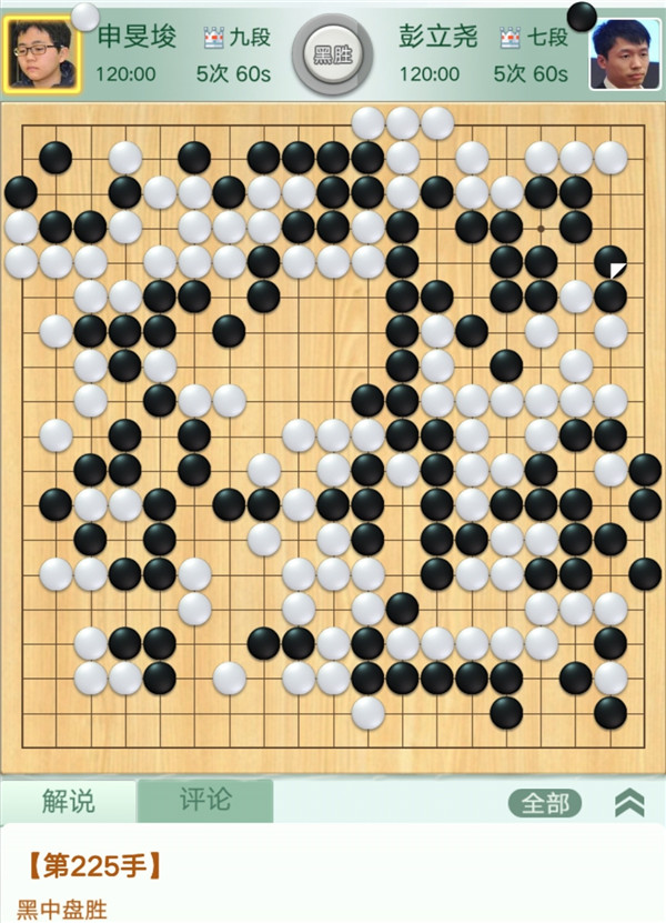 第三臺(tái)慢棋,由深圳隊(duì)外援申旻埈九段執(zhí)白對(duì)陣彭立堯七段。開局右邊黑棋行棋過分,但白棋對(duì)殺時(shí)出現(xiàn)較大失誤,將雙活走成被殺,黑棋大幅領(lǐng)先。之后黑棋右上角又出現(xiàn)失誤,將一塊棋送死,局面接近。上方作戰(zhàn)雙方都有一定的失誤,形勢(shì)劇烈波動(dòng),最終形成打劫。黑棋依仗劫材有利,放棄左上角將右上吃掉白棋棋筋活出,便宜巨大,獲得最終勝利,申旻埈執(zhí)白中盤負(fù)彭立堯。這一盤,教練羅洗河九段認(rèn)為“下得是真奇葩!”
