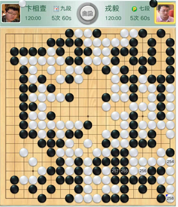 第二臺(tái)主將臺(tái),由深圳隊(duì)戎毅七段執(zhí)黑對(duì)陣江西隊(duì)外援卞相壹九段。開局黑取實(shí)地白取外勢(shì),局面接近。中盤黑棋在中央放棄出頭花兩手棋吃掉左下角白棋稍小,白棋棄角后圍住中央巨空,白稍好。官子階段白棋左上形狀處理有誤,黑棋未能抓住沖擊機(jī)會(huì),選擇大幅退讓,最終目數(shù)不夠。戎毅執(zhí)黑負(fù)卞相壹。