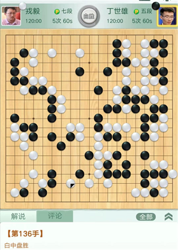 第三臺(tái)慢棋,由深圳隊(duì)戎毅七段執(zhí)白對(duì)陣衢州隊(duì)丁世雄五段。開局右下角變化黑棋虧損。之后白棋右上角試應(yīng)手時(shí),黑棋選擇脫先吃白中間殘子失誤。白棋棄掉幾子在右上黑空先手活出,大幅領(lǐng)先。之后白棋安全運(yùn)轉(zhuǎn)直至終局,戎毅執(zhí)白中盤勝丁世雄。