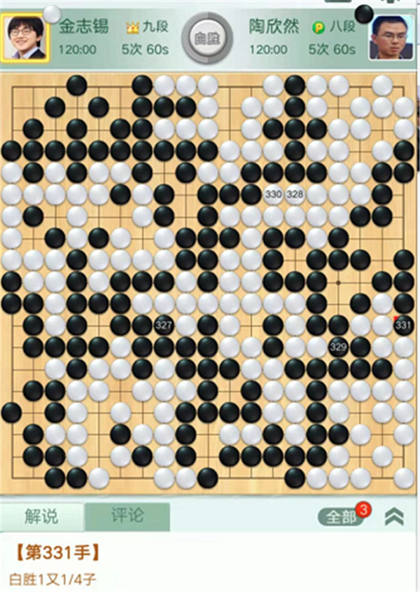 第二臺(tái)主將臺(tái),由深圳隊(duì)陶欣然八段執(zhí)黑對(duì)陣衢州隊(duì)韓國外援、世界冠軍金志錫九段。開局下方戰(zhàn)斗雙方各有失誤,局面依然均勢。之后左上角形成打劫,白棋棄劫右上打穿黑空各有所得。黑棋攻擊左上角白棋時(shí)候白棋應(yīng)對(duì)失誤,黑棋取得領(lǐng)先。白棋看到形勢不利放出勝負(fù)手,打入上邊黑空過分,黑棋反擊后白棋極其危險(xiǎn)。關(guān)鍵時(shí)候黑棋鼠標(biāo)點(diǎn)錯(cuò),給自己留下一個(gè)斷點(diǎn),被白棋活出后,局面難以挽回,陶欣然執(zhí)黑1又1/4子負(fù)金志錫。