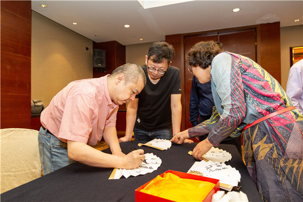 閉幕式上,嘉賓為圍棋愛好者折扇簽名。
