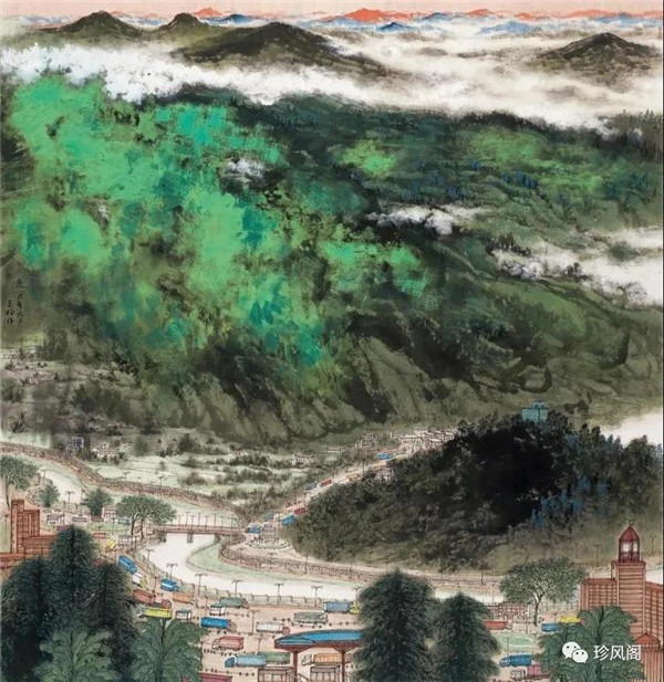 來自南京而定居于深圳的宋玉明,試圖將新金陵畫派表現(xiàn)現(xiàn)實的變革精神用于現(xiàn)代城市山水畫的探索上。作為新金陵畫派的第二代畫家,宋玉明直接承傳了宋文治表現(xiàn)現(xiàn)代太湖人居環(huán)境秀潤而精巧的家法,并將此種大山景加小民居的畫法轉用到深圳城市形態(tài)的表現(xiàn)上。這里,我們一方面可以看到深圳作為一個新興的現(xiàn)代城市借山而筑、注重自然環(huán)境在城市生態(tài)建設上的積極作用;另一方面,深圳這種與自然相統(tǒng)一的現(xiàn)代化城市建設理念,也為宋玉明進行城市山水畫創(chuàng)作提供了完美的表現(xiàn)對象。在《深圳文錦渡》等作品里,我們看到了畫家巧妙地將城市現(xiàn)代建筑與自然山水融為一體的表現(xiàn)。這些畫作,大多以勾線渲染的方法表現(xiàn)遠景中的商用或市政建筑設施,也因這些建筑被設置在中遠景,不僅減少了建筑塑造的困窘,而且突出了這些人居建筑與自然相得益彰的和諧關系。這些畫作,從嚴格的意義上說,仍然是山水畫,而宋式小散鋒皴以及云煙雨霧的渲染,也為畫面增添了幽深、恬靜、高雅、平和的意趣與境界。這些畫作,讓我們所熟悉的城市從一個相對遙遠的視角來觀看,既因距離產(chǎn)生了一種從未體驗過的美感,也較好地體現(xiàn)了現(xiàn)代城市與自然占位的協(xié)調統(tǒng)一、舒適宜居的比例關系。
