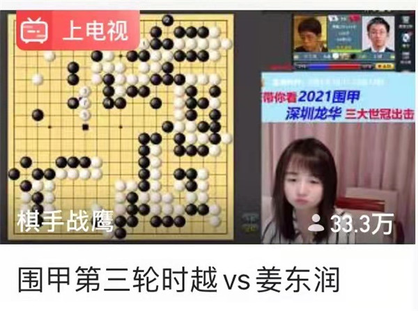 今日虎牙直播對(duì)深圳龍華隊(duì)的現(xiàn)場(chǎng)講解點(diǎn)評(píng)沖上了33.3萬(wàn)人次的大關(guān),人氣可謂一路上升!職業(yè)女棋手戰(zhàn)鷹解說(shuō)生動(dòng)有趣,棋迷們聽得也過(guò)癮。再有“龍哥”“申一冠”的迷粉,直播室熱鬧非凡!戰(zhàn)鷹是圍棋知名主播,作為深圳龍華隊(duì)網(wǎng)上直播合作人,為龍華隊(duì)的宣傳還真是帶來(lái)不小的效應(yīng)!明天繼續(xù)吧。