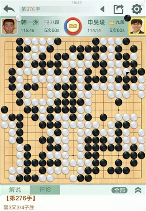 時(shí)越快棋執(zhí)黑對(duì)陣世界冠軍陳耀燁。中盤黑棋在右邊白勢(shì)中試應(yīng)手,白棋應(yīng)對(duì)松緩,被黑棋先手便宜十幾目棋,黑局面領(lǐng)先。之后黑棋行棋嚴(yán)謹(jǐn),中盤獲勝。