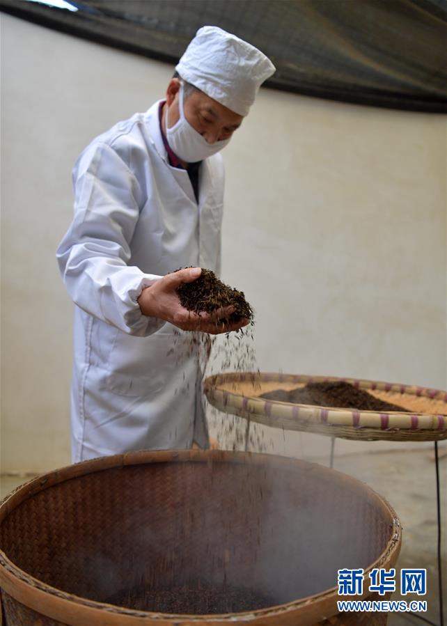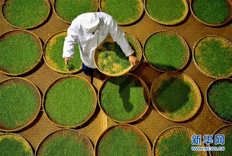 產(chǎn)于湖北省恩施土家族苗族自治州利川市毛壩鎮(zhèn)楠木村的“冷后渾”鮮葉,是制作利川紅茶最為優(yōu)質(zhì)的原料。工人先采下“冷后渾”茶樹鮮葉,后經(jīng)萎凋、揉捻、發(fā)酵、烘烤、篩選、整形、品級等工藝,歷時十多個小時,最終制成的紅茶沖泡后湯色紅艷明亮、滋味醇厚甘爽。在茶湯冷卻后,湯色逐漸變渾,加熱后又恢復紅艷明亮,這也是“冷后渾”得名的由來。新華社發(fā)楊順丕攝