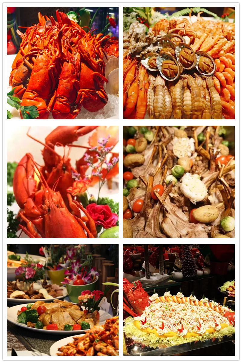 生猛龍蝦、阿拉斯加蟹腳、九節(jié)蝦、三文魚(yú)刺身