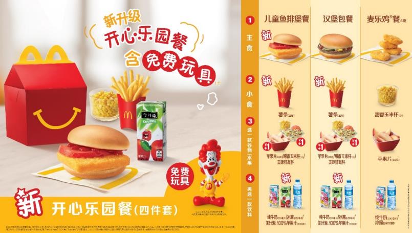 新開心樂園餐餐單,由三件套升級(jí)為四件套,增加蔬果的選擇及比重