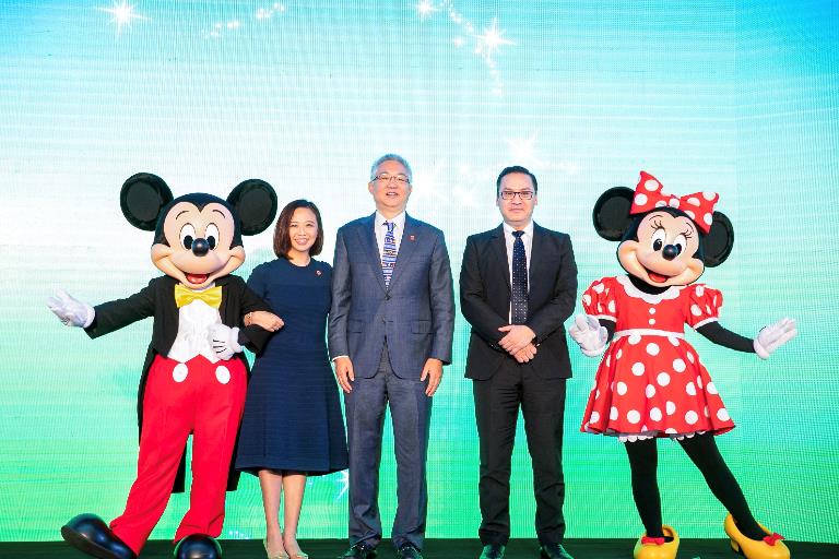 麥當(dāng)勞中國董事會(huì)主席張懿宸先生(中)、麥當(dāng)勞中國首席執(zhí)行官張家茵女士(左二)、迪士尼中國影業(yè)及品牌管理副總裁及總經(jīng)理徐隆立先生(右二)、米奇和米妮(左一及右一),共同見證合作