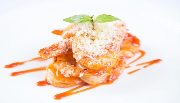 做法:將大蝦去除紗線并清潔干凈,放入冰水中靜置10分鐘;將蝦取出后擦干水分,放入熱鍋中炸至背脊翻開(kāi);放入蔥姜段翻炒,放茄汁和糖調(diào)味;出鍋時(shí)快速放入芝士翻炒,出鍋裝飾即可。