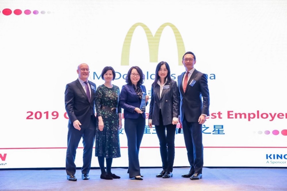 麥當(dāng)勞中國(guó)首席人員官王艷偉(中 )代表公司接受2019“怡安中國(guó)最佳雇主”稱(chēng)號(hào)