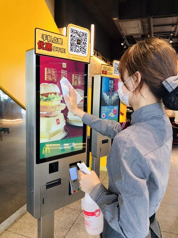 目前全國所有的麥當勞餐廳啟動上班員工測溫流程,并提高員工洗手消毒頻次,全國餐廳全員佩戴口罩。在餐廳為顧客提供免洗洗手液,對所有餐廳的通風系統(tǒng)和顧客常接觸的設施,強化消毒并增加頻次,包括大門把手、自助點餐屏、樓梯扶手、柜臺臺面、取餐區(qū)、桌椅、餐盤、兒童椅、兒童樂園等。