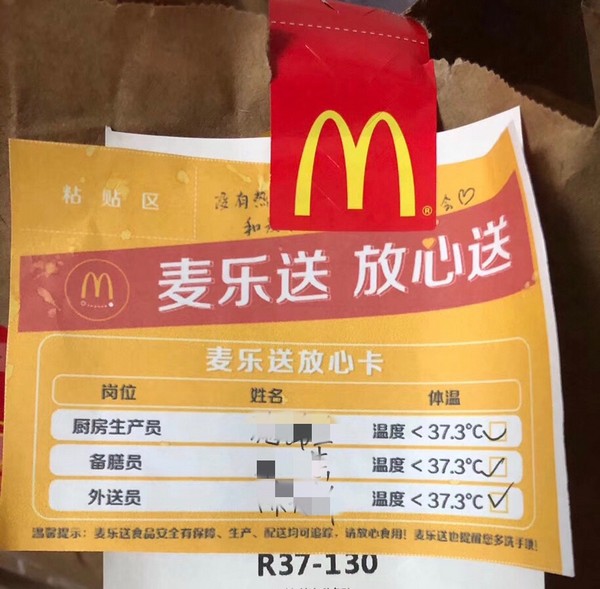 為了讓顧客放心,麥當勞在安全服務的前提下,餐廳實施“無接觸配送”和“無接觸到店取餐”。所有外送訂單均附上“麥樂送放心卡”,標注生產、配膳、外送人員姓名及體溫,做到餐品、人員可追蹤。顧客可選擇讓外送員將餐品送到指定位置取餐,在手機、餐廳自助點餐機或柜臺點餐后,無論堂食或外帶,員工都會將制作好的餐點裝入打包袋并封口,放置到取餐處。