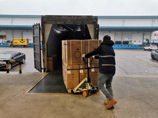 倉(cāng)庫(kù)員工將如新中國(guó)捐贈(zèng)的400臺(tái)空氣凈化器出庫(kù)