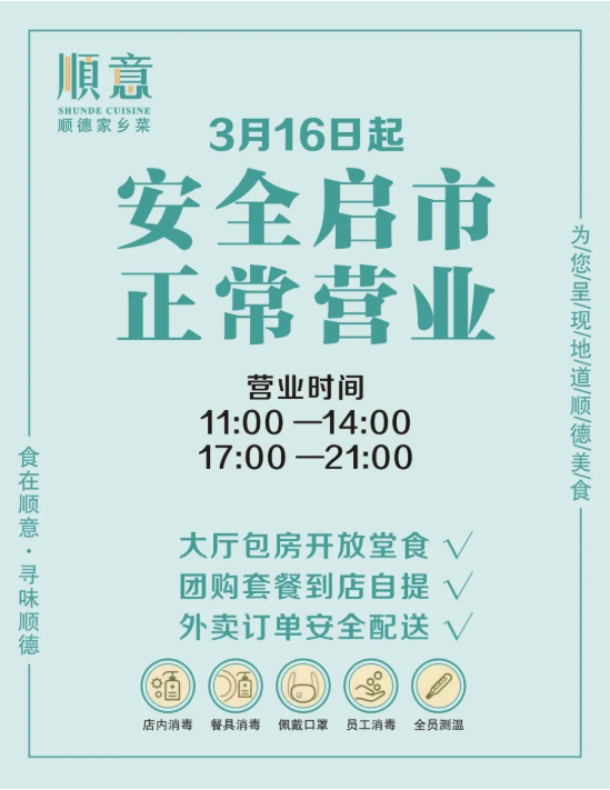 近日,記者發(fā)現(xiàn),深圳人喜愛(ài)的順德菜之一順意順德家鄉(xiāng)菜深圳3家門店福華一路店、車公廟店、科技生態(tài)園店已于3月16日全面恢復(fù)正常營(yíng)業(yè),同時(shí),大廳包房均可開(kāi)放堂食,外賣服務(wù)同樣進(jìn)行中,不方便到店消費(fèi)的也可以叫外賣。