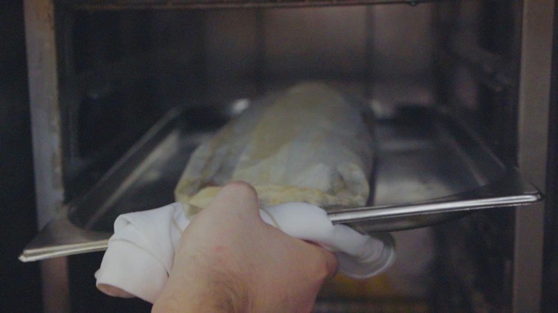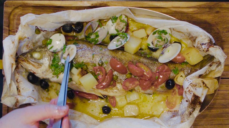 清蒸鱸魚是常見的粵式吃法,本期,四季酒店主廚畢柏克為吃貨們帶來(lái)別樣的鱸魚吃法——“烤紙包鱸魚”。他將魚進(jìn)行腌制后,用烘焙用紙裹緊,在烤爐中烤制40分鐘。吸收了海鮮文蛤、白葡萄酒精華的魚肉緊實(shí)鮮嫩,在打開外包紙的那一刻,香氣四溢,讓人欲罷不能。如此烹法,也能最大限度保存魚的營(yíng)養(yǎng)和鮮美。