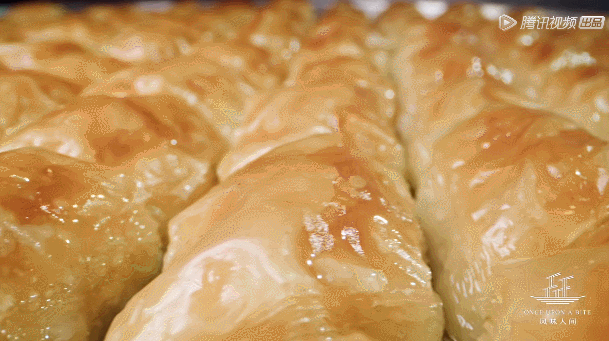 這還沒到核心。巴克拉瓦最關(guān)鍵的步驟是熬糖,只有資歷最老的師傅才能掌握,溫度、酸度、水、時間讓糖液達(dá)到平衡,于是,我們看到完美的最后一步:
