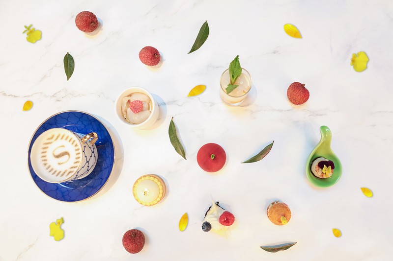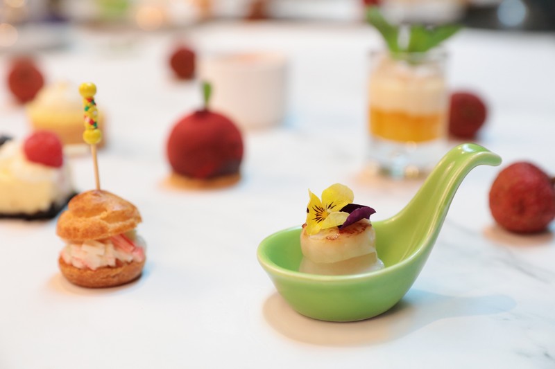 酒店餅房廚師長(zhǎng)趙偉匠心獨(dú)運(yùn),使荔枝和傳統(tǒng)下午茶碰撞出別樣風(fēng)情:芒果恰到好處的酸甜邂逅荔枝的宜人甘美,香芒荔枝慕斯杯里滿載的不就是夏天的專(zhuān)屬甜蜜;芝士蛋糕的醇厚滋味被荔枝的清爽巧妙平衡,多層次的口感讓人無(wú)限回味;當(dāng)俏皮可人的荔枝被加入傳統(tǒng)甜品楊枝甘露,搭配冰涼爽口的荔枝雪芭,是妙趣橫生的獨(dú)特味覺(jué)體驗(yàn);法式焦糖燉蛋和荔枝的融合,恍若天成,是中西合璧的典范;日本帶子和荔枝的組合聽(tīng)來(lái)不可思議,只有親試方能體會(huì)海陸鮮甜交匯的真意。