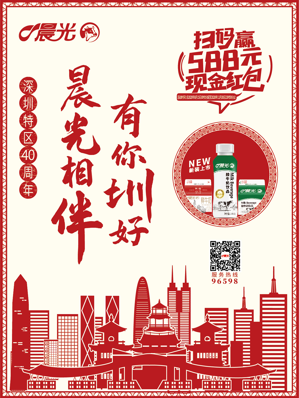 見(jiàn)圳客戶(hù)端·深圳新聞網(wǎng)2020年8月25日訊 作為深圳本土的國(guó)營(yíng)乳制品公司,晨光乳業(yè)以“深圳特區(qū)40周年,晨光相伴,有你圳好”為主題,致敬深圳經(jīng)濟(jì)特區(qū)建立40周年。作為一家“深圳老字號(hào)”品牌企業(yè),晨光乳業(yè)以40周年為契機(jī),推出全新升級(jí)包裝的240g酸牛奶飲品以及掃碼贏588元紅包等多個(gè)主題活動(dòng),在與千萬(wàn)深圳市民分享晨光40年的喜悅之情的同時(shí)共慶深圳經(jīng)濟(jì)特區(qū)成立40周年!