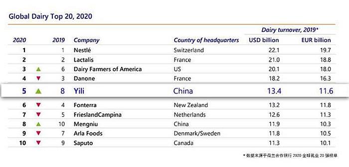 中新網(wǎng)9月1日電 近日,中國乳業(yè)曝出一個令國人欣喜的消息:在荷蘭合作銀行公布的“2020年全球乳業(yè)20強(qiáng)”排名中,中國伊利集團(tuán)排名飆升至第五,成功躋身全球乳業(yè)五強(qiáng)。