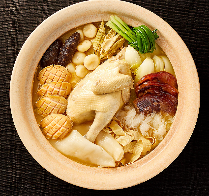 “凍齡”爸爸秘制花膠雞采用天然泉水湯底和原生態(tài)雞材,無(wú)味精無(wú)添加。除了招牌花膠雞煲之外,還有豪華版的鮑魚(yú)花膠雞煲、海參鮑魚(yú)花膠雞煲及眾多創(chuàng)意精美的小菜小食。